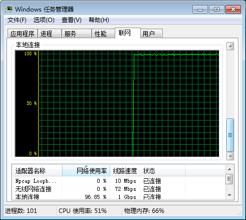 对应的资源管理器情况,此时千兆网卡性能达到96.85%。