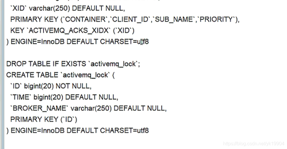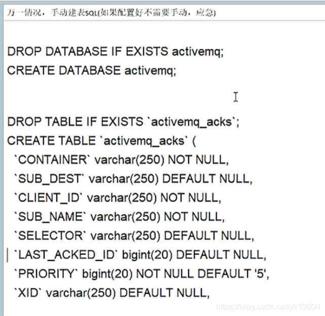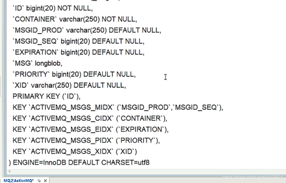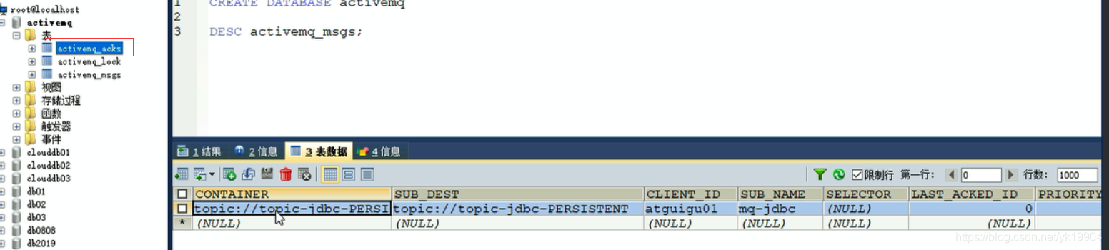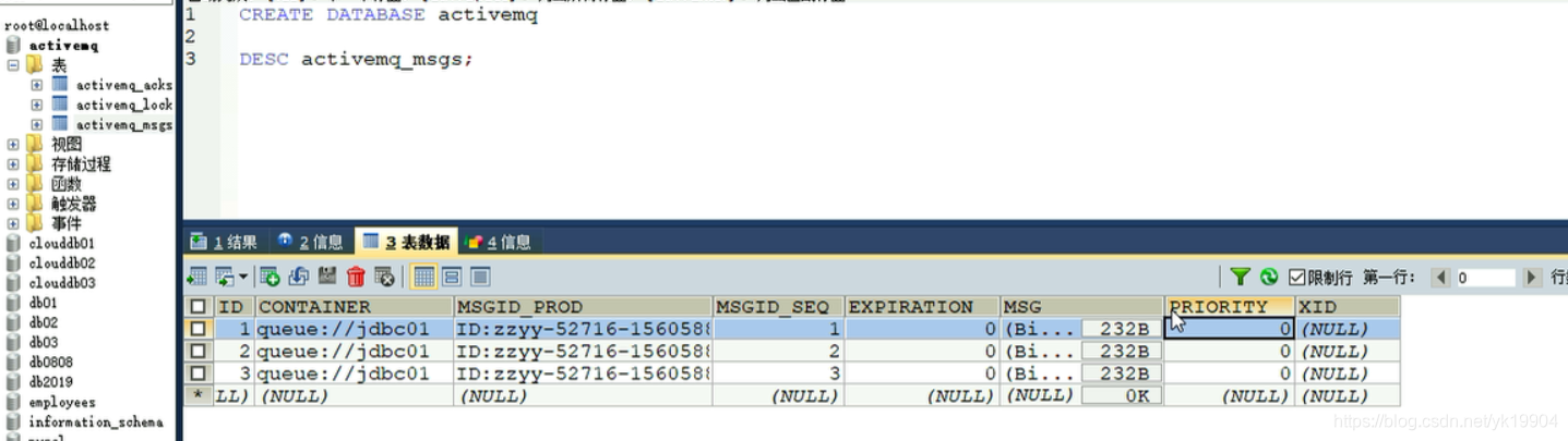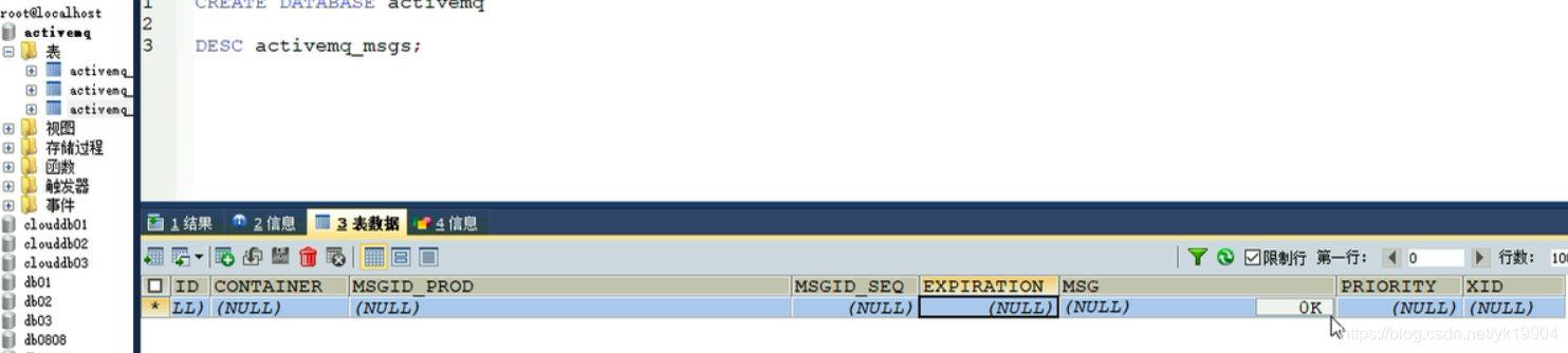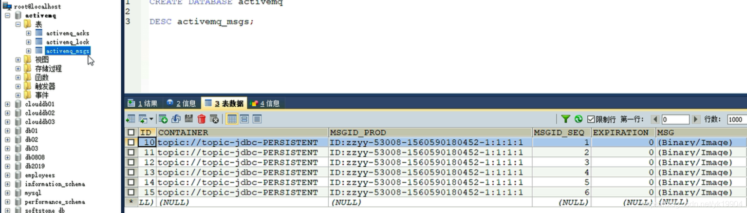 启动ActiveMQ,配置生效,自动生成三张表