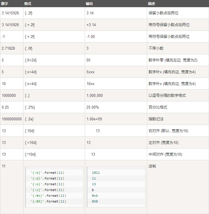 #!/usr/bin/env python #-*- coding:utf8 -*- print("I am %s stduy %s" %("hujianli","python")) print("I am {0} stduy {1}".format("hujianli","python") ) str = "I am {0} stduy {1}" name = ("hujianli","python") print(str.format(*name)) print("%d + %d = %d" % (2,3,2+3)) print("%d + %d = %d" % (3,7,3+7)) print(" 分割线 ".center(100,"*")) template = '编号:%09d\t 公司名称:%s \t 官网 :http://www.%s.com' arg1 = (7, "xxx方", "futong") print(template%arg1) template2 = "编号:{:0>9s}\t公司名称:{:s} \t 官网:http://www.{:s}.com " context1 = template2.format("7", "百度", "baidu") print(context1) 占位符 说明 %s 字符串(采用str()的显示) %r 字符串(采用repr()的显示) %c 单个字符 %b 二进制整数 %d 十进制整数 %i 十进制整数 %o 八进制整数 %x 十六进制整数 %e 指数 (基底写为e) %E 指数 (基底写为E) %f 浮点数 %F 浮点数,与上相同 %g 指数(e)或浮点数 (根据显示长度) %G 指数(E)或浮点数 (根据显示长度) print("hello,%s" % "world") print('小智今年 %s 岁了' % 18) print('小智今年 %s 岁了' % 19) print('小智今年 %d 岁了' % 20) print("圆周率PI 的值为 %.2f" % 3.14) # 输出类似1.23%这样的结果 print("小智的识别能力比去年提高了:%.2f" % 1.25+"%") print("小智的识别能力比去年提高了:%.2f%%" % 1.26 ) # 输出百分号 print("输出百分号:%s" % "%") # 字符串格式化元组 print("今年是%s年,奥运会第%s,中国获得%d枚金牌" % ('2016', '10', 20)) # 宽度和精度 print("圆周率PI 的值为:%10f" % 3.1415926) print("保留2位小数,圆周率PI 的值为:%10.2f " % 3.1415926) print("字符串精度获取:%.5s" % ("hello world") ) print ('从元组中获取字符串精度:%*.*s' % (10,5,'hello world')) print ('从元组中获取字符串精度:%.*s' % (5, 'hello world')) #符号、对齐和0填充 print ('圆周率PI 的值为:%010.2f' % 3.141593) #减号(-)用来左对齐数值 print ('圆周率PI 的值为:%10.2f' % 3.14) print ('圆周率PI 的值为:%-10.2f' % 3.14) # 加号(+)表示无论是正数还是负数都表示出符号 print(('宽度前加加号:%+5d'%10)+'\n'+('宽度前加加号:%+5d'%-10))