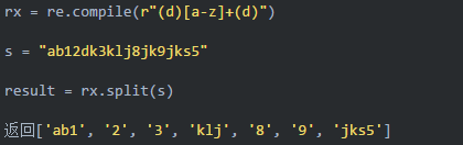 如果正则表达式中存在分组,则把分组匹配到的内容放在列表中每两个分割的中间作为列表的一部分,如: