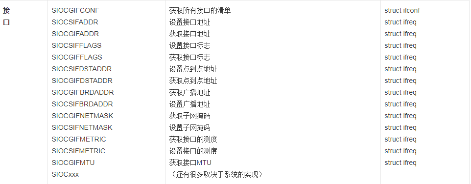 Linux 下 可以使用ioctl()函数 以及 结构体 struct ifreq 结构体struct ifconf来获取网络接口的各种信息。