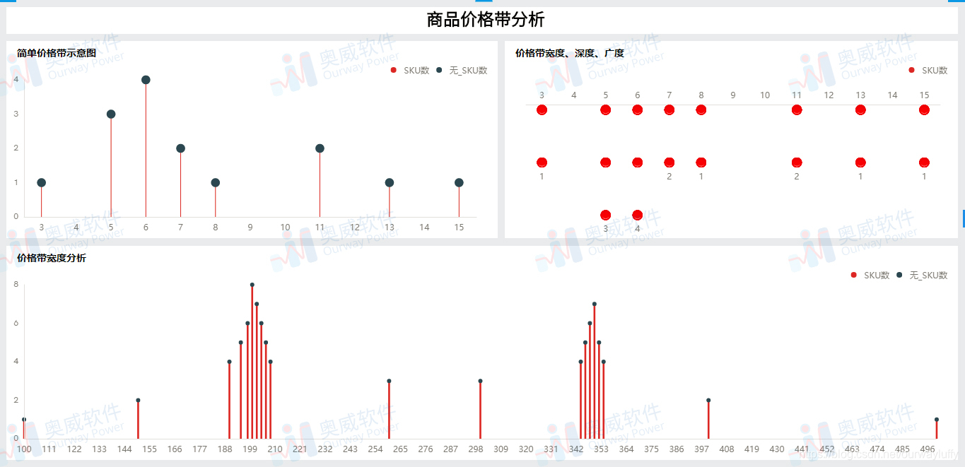 简单价格带示意图——主要呈现价格宽度比较小的简单商品的价格线的分布,可以看到商品的价格宽度和价格线条数以及价格带的深度;价格带宽度、深度、广度——主要是价格带的另一种呈现方式,主要突出价格带深度,纵坐标的图标数量就表示每一条价格线下的SKU数;价格带宽度分析——是简单价格带示意图丰富化。