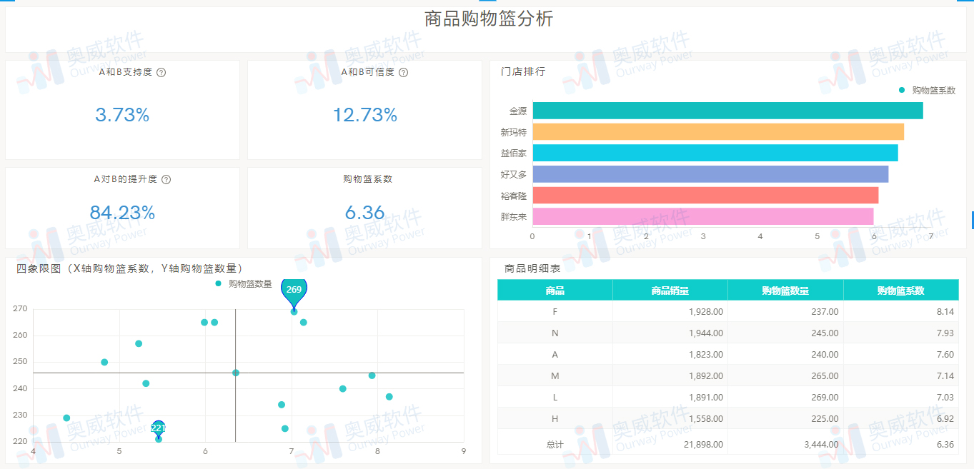 面分析——购物篮系数的门店排行、购物篮数量-购物篮系数的四象限图、商品明细表。