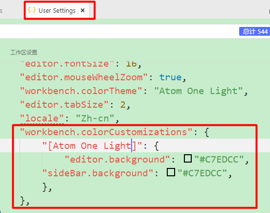 3. 重启/打开vscode,设置主题中选择Atom One Light主题,并在用户自定义设置中,追加以下代码:
