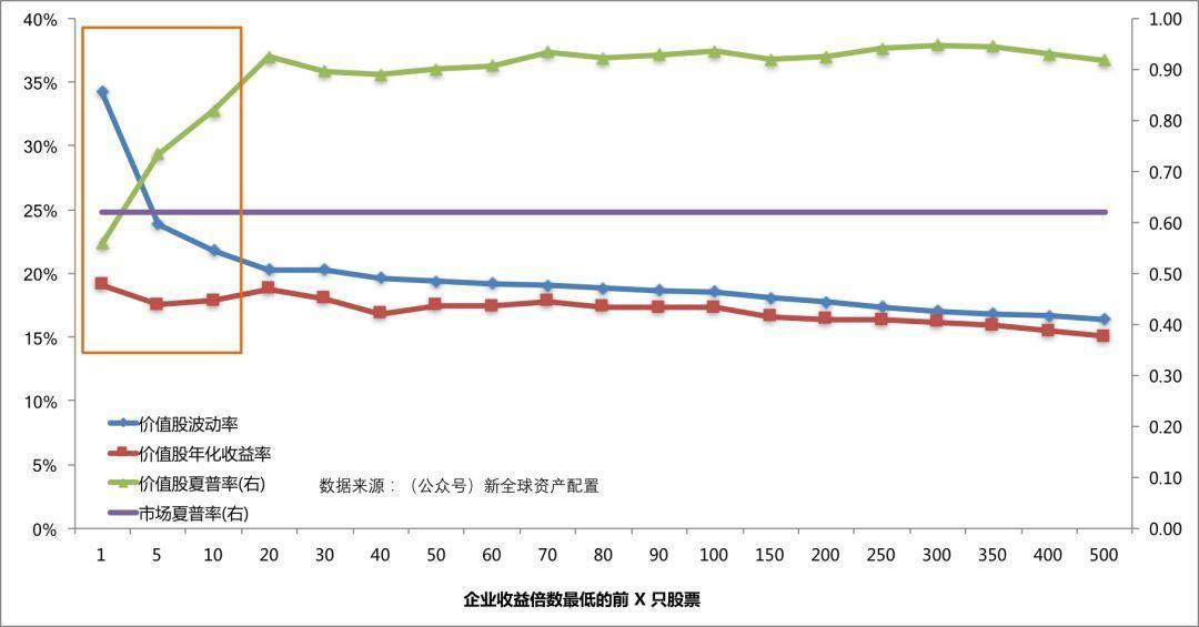 我曾做过此类测试。基于企业收益倍数这个估值维度来选股的话,随着持仓数量的下降(x轴),虽然策略的年化收益率在逐渐上升,但是策略的夏普比率,在只有20只股票持仓后发生了断崖式的下跌,波动率也发生了大幅的上涨。