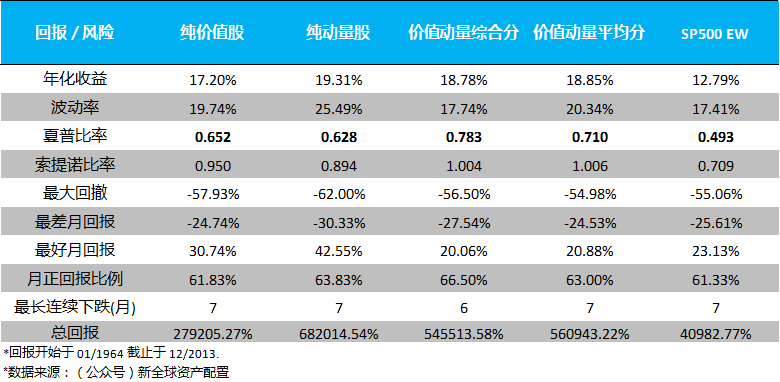 价值动量平均分:单纯的平均投资。1美元,50%投入纯价值股,另外50%投入纯动量股。