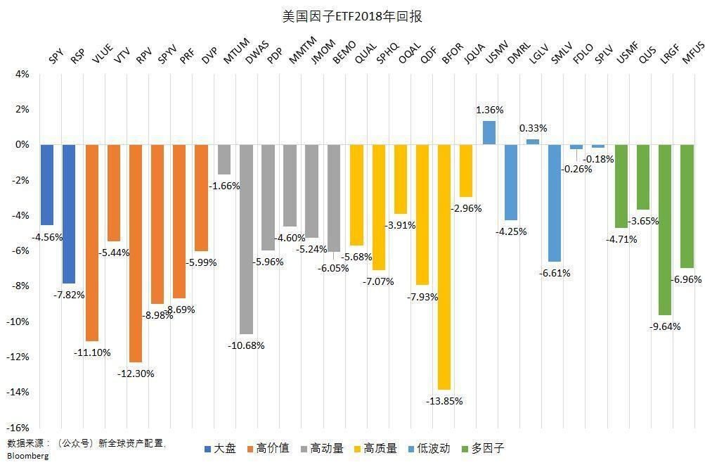 比如下图中,我从5个组别(高价值、高动量、高质量、低波动、多因子)中,选取了比较出名的28只美国市场上的因子ETF。仅有2只低波动ETF在2018年收正,其余的26只,有20只都没有跑赢标普500ETF。而且在同特征的因子组中,各大公司ETF的表现,也有明显的不同。