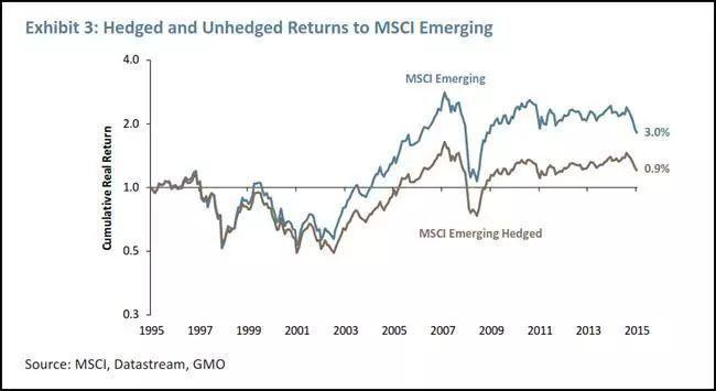 GMO在其2015年的一份报告中有一张图,指出纵然在2014-2015年间新兴市场的货币贬值了不少,但是回看20年的周期,做了货币对冲的MSCI新兴市场指数大幅跑输没有做货币对冲的指数。