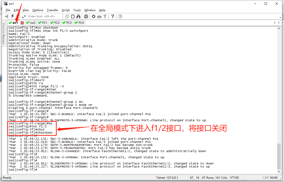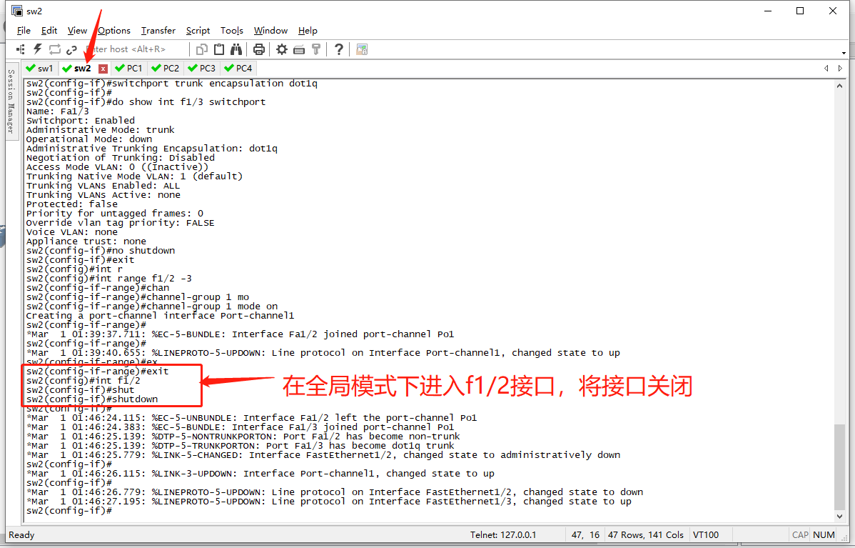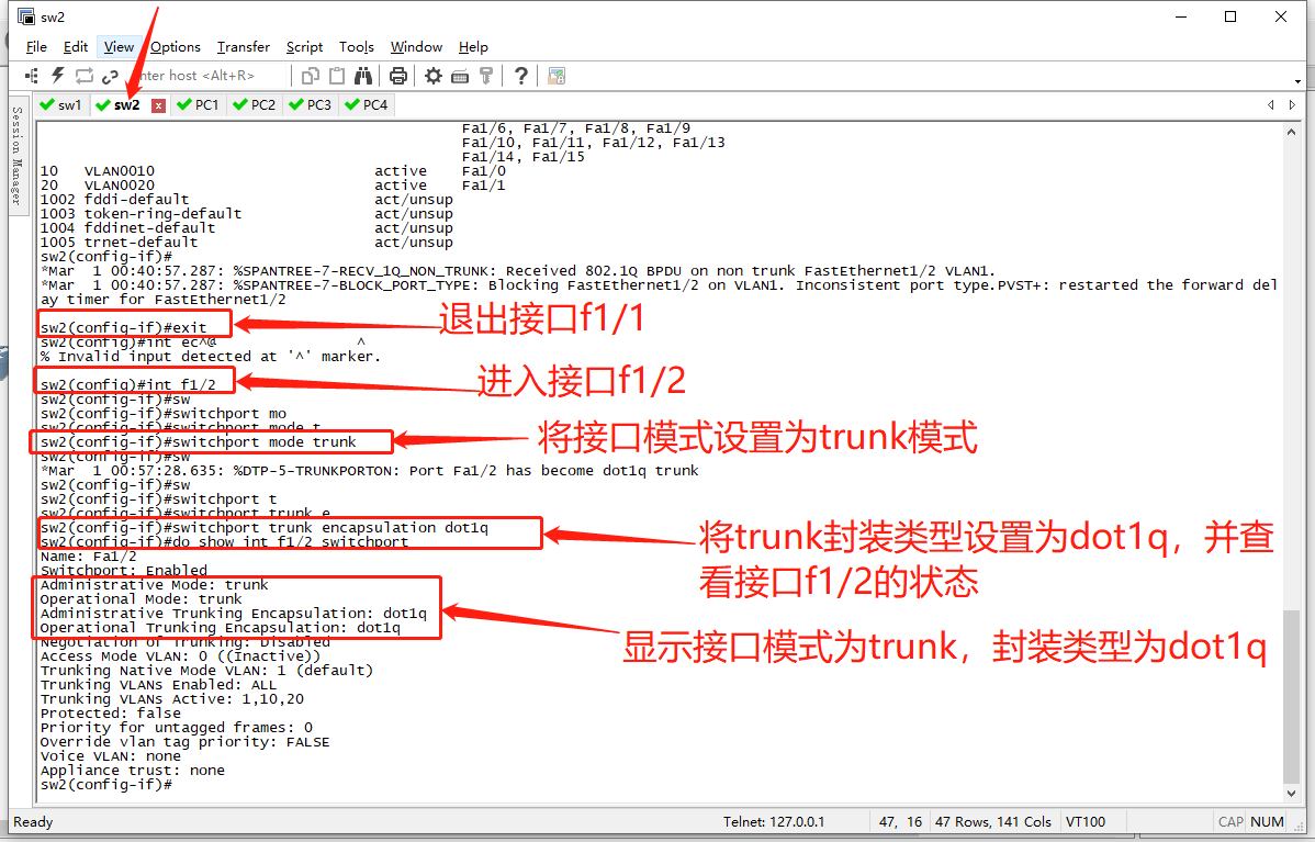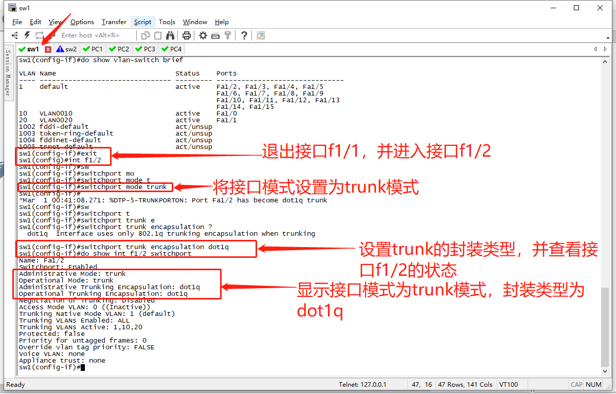 7.进入F1/2接口,将接口模式设置为trunk,设置trunk封装类型为dot1q,然后检查接口状态,确认设置成功