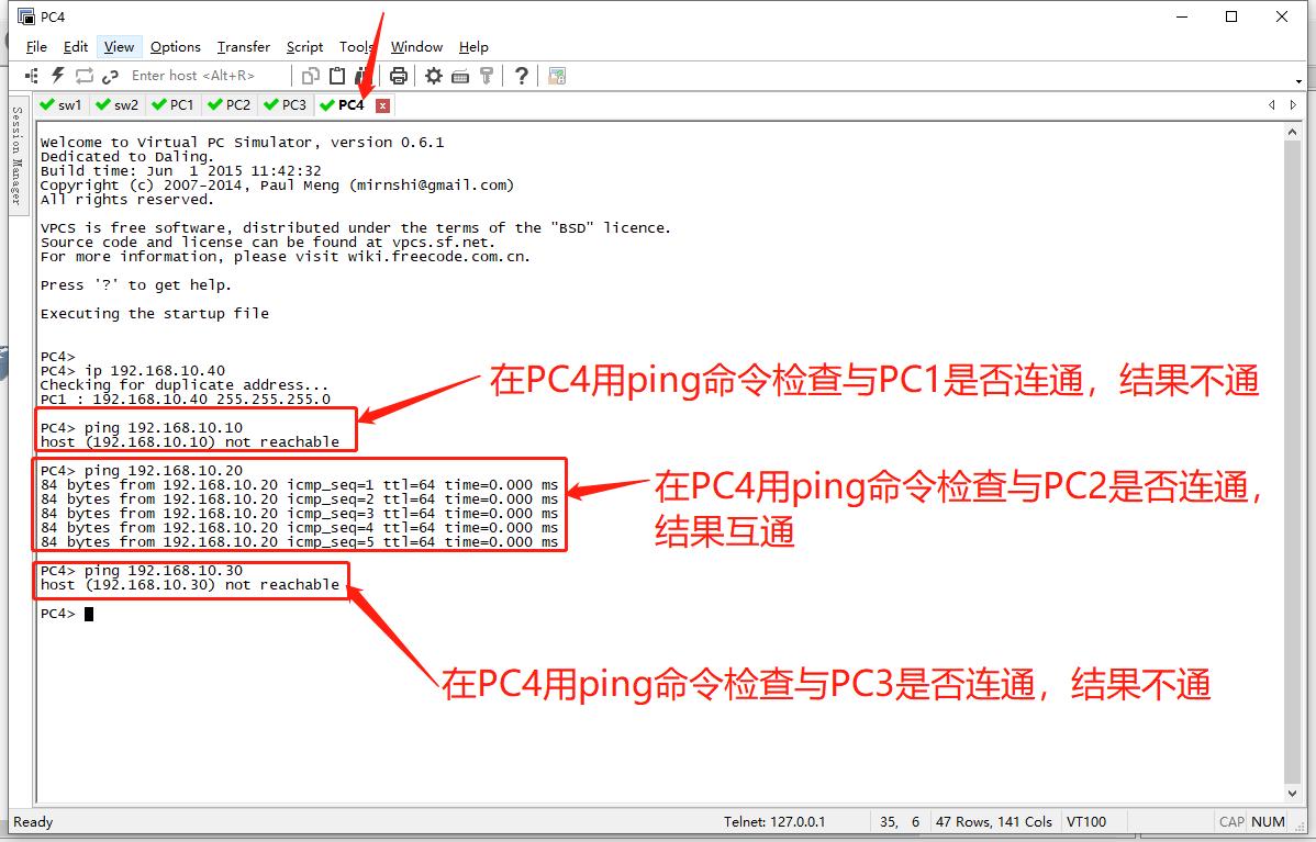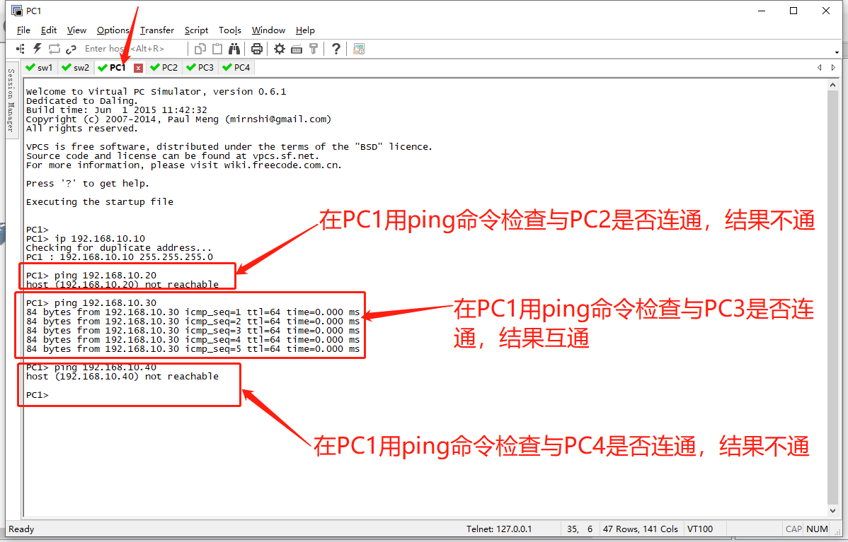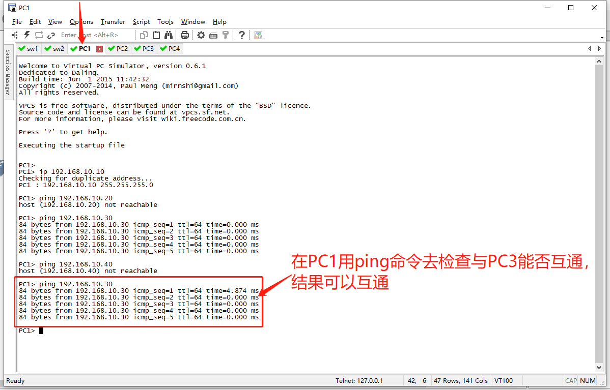 14.检查PC1与PC2、PC3、PC4是否能互通,结果显示PC1只能与PC3互通,因为PC1与PC3是相同vlan