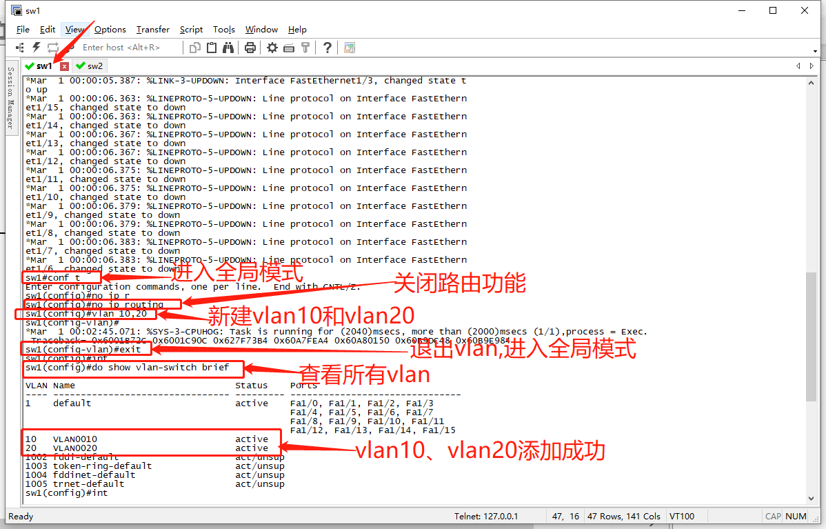 5.双击sw1进入sw1仿真面板,先进入全局模式,关闭路由功能,然后新建两个vlan,检查是否添加成功,结果显示添加成功