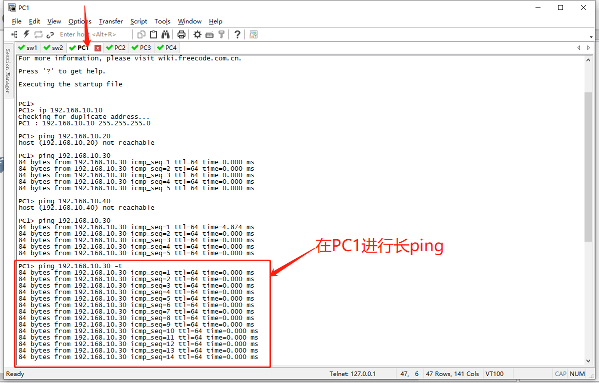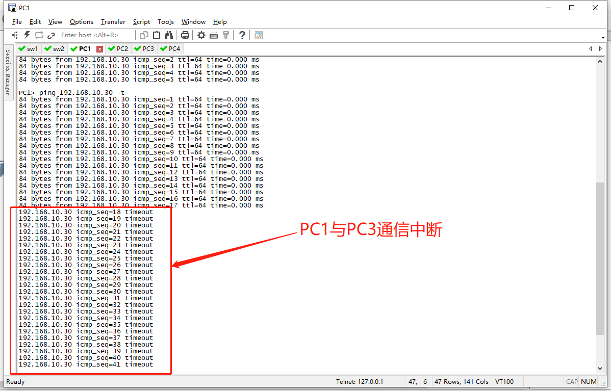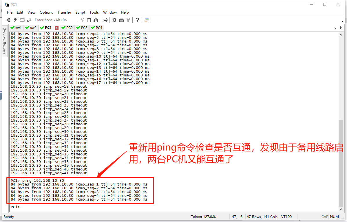 26.重新使用ping命令,检查PC1与PC2能否互通,结果能够互通,因为备用链路保持了通信的正常检查互通:ping 192.168.10.30
