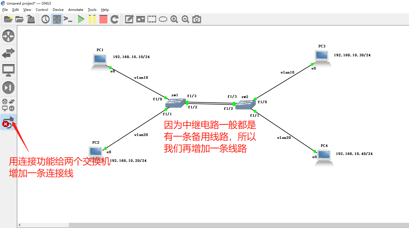 16.给交换机sw1和交换机sw2,再添加一条链路,应为一般中继链路,都会有一条备用链路防止突发状况,当其中一条链路发生故障时,另一条链路仍能保证正常的通信