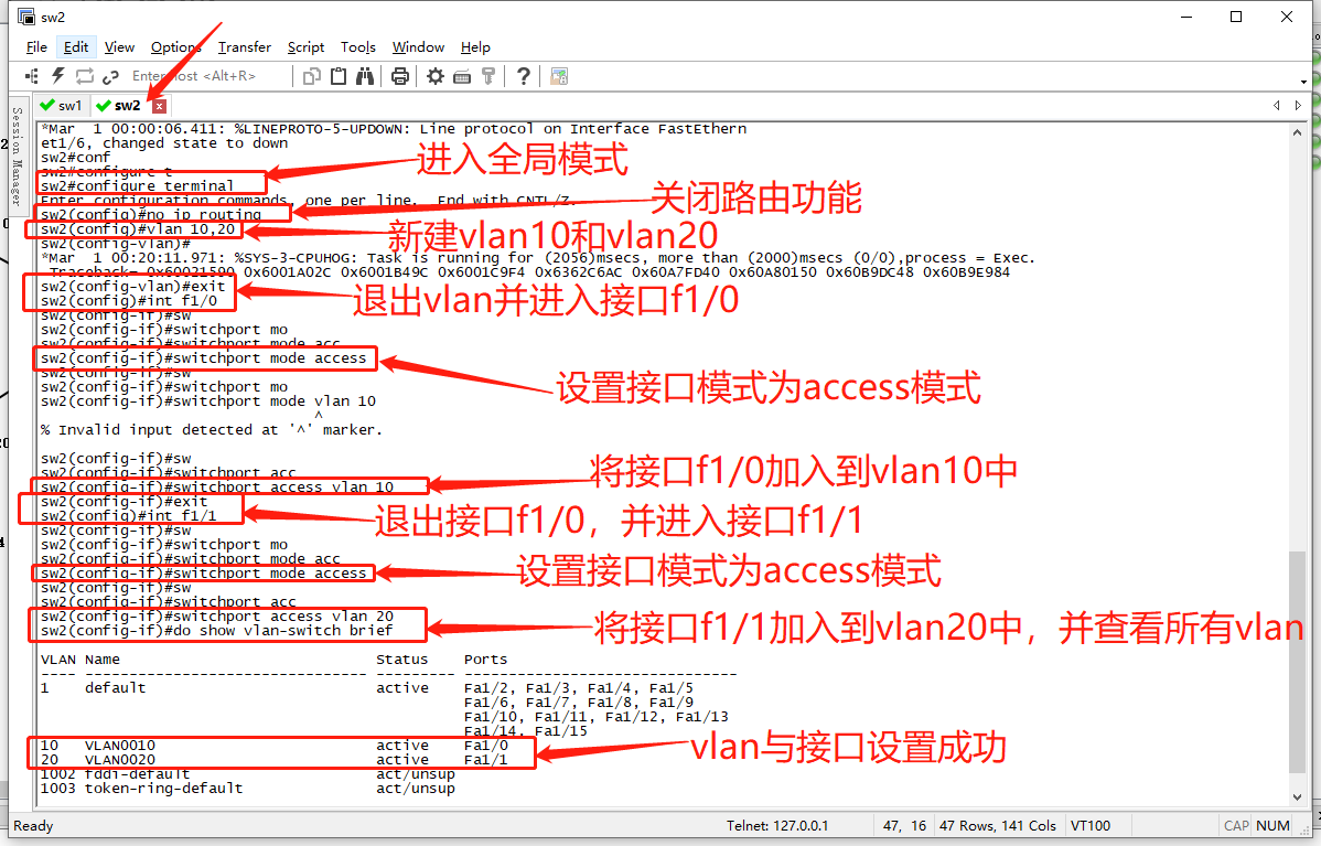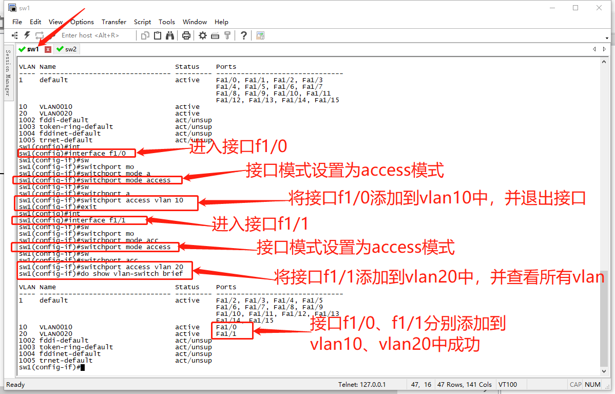 6.分别进入接口F1/0、F1/1,将接口模式均设为access,然后分别加入vlan10、vlan20,并检查是否设置成功