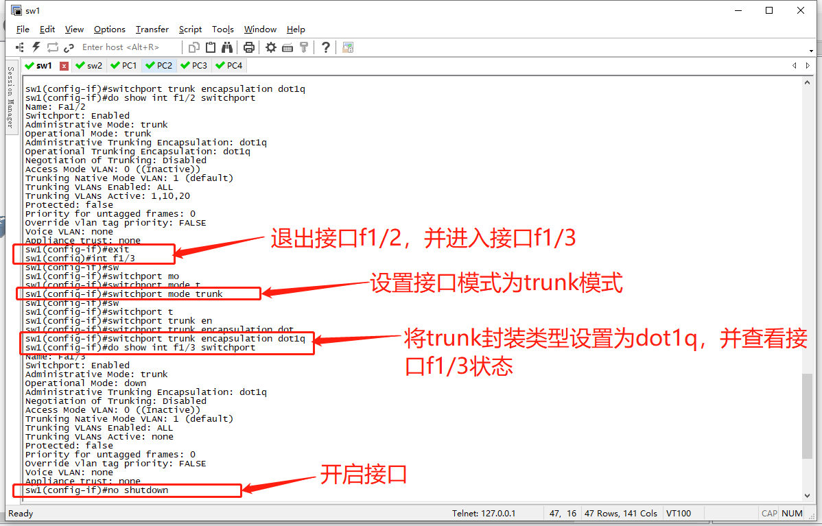 17.在sw1中进入接口F1/3,将接口模式设置为trunk,设置trunk封装类型为dot1q,然后检查接口状态,确认设置成功,然后开启接口