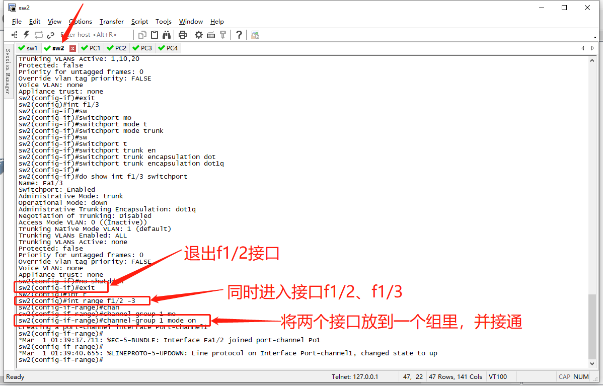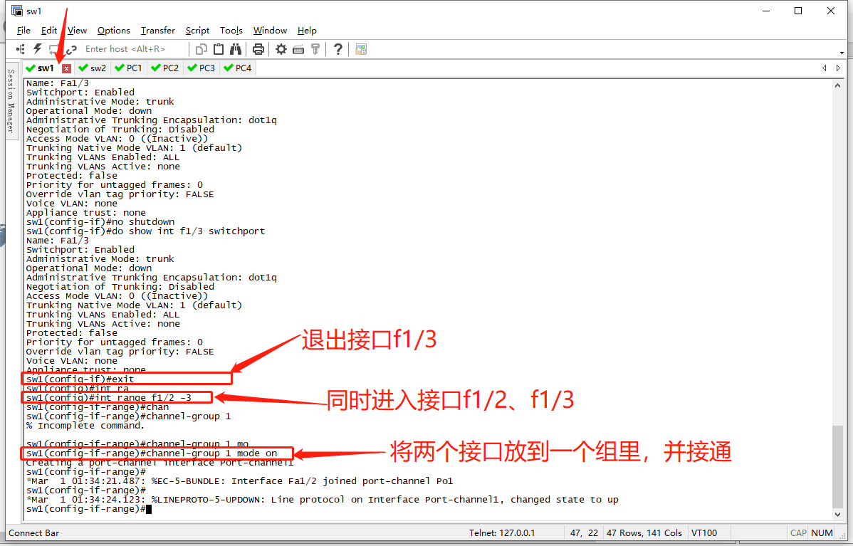 19.在sw1中将接口F1/2与F1/3放到同一个组里,并接通