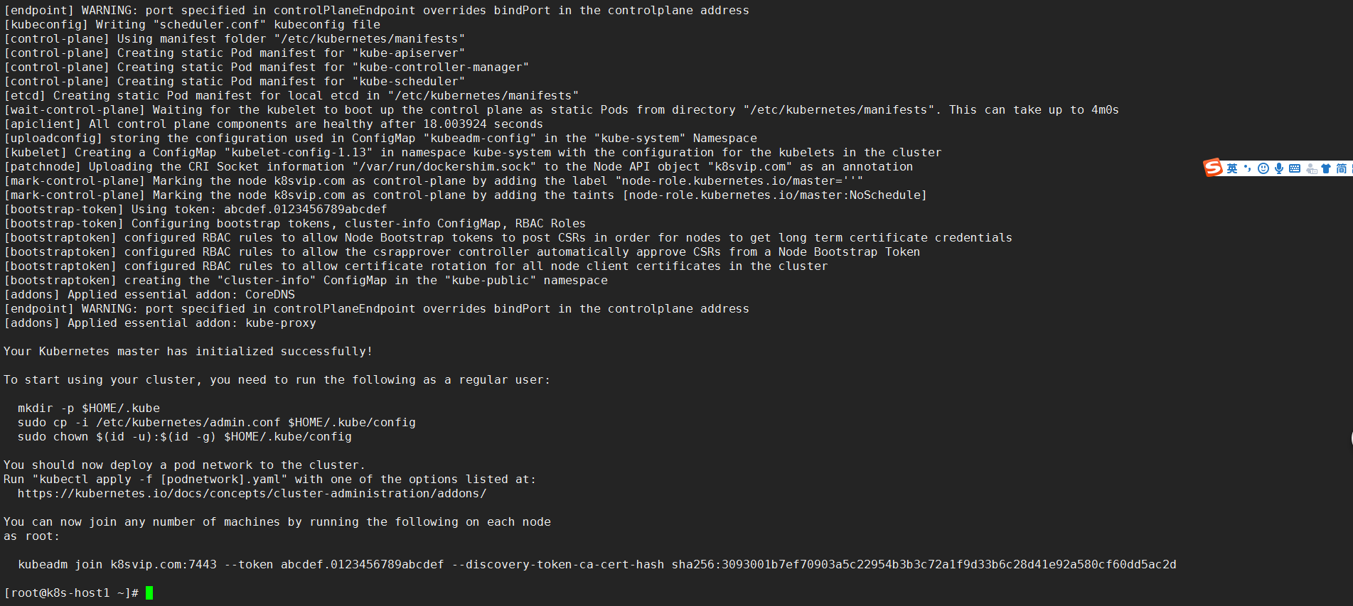 kubeadm join k8svip.com:7443 --token abcdef.0123456789abcdef --discovery-token-ca-cert-hash sha256:3093001b7ef70903a5c22954b3b3c72a1f9d33b6c28d41e92a580cf60dd5ac2d