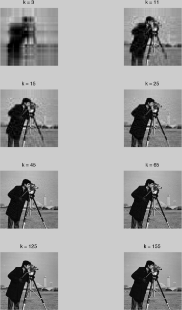 %%%%%%%// Pre-processing stage clear all; close all; %// Read in image - make sure we cast to double B = double(imread('cameraman.tif')); %// Calculate covariance matrix sigma = cov(B); %// Find eigenvalues and eigenvectors of the covariance matrix [A,D] = eig(sigma); vals = diag(D); %// Sort their eigenvalues [~,ind] = sort(abs(vals), 'descend'); %// Rearrange eigenvectors Asort = A(:,ind); %// Find mean subtracted data Bm = bsxfun(@minus, B, mean(B,1)); %// Reproject data onto principal components Bproject = Bm*Asort; %%%%%%%// Begin reconstruction logic figure; counter = 1; for k = [3 11 15 25 45 65 125 155] %// Extract out highest k eigenvectors Aq = Asort(:,1:k); %// Project back onto original domain out = bsxfun(@plus, Bproject(:,1:k)*Aq.', mean(B, 1)); %// Place projection onto right slot and show the image subplot(4, 2, counter); counter = counter + 1; imshow(out,[]); title(['k = ' num2str(k)]); end As you can see, the majority of the code is the same from what we have seen. What's different is that I loop over all values of k, project back onto the original space (i.e. computing the approximation) with the k highest eigenvectors, then show the image.