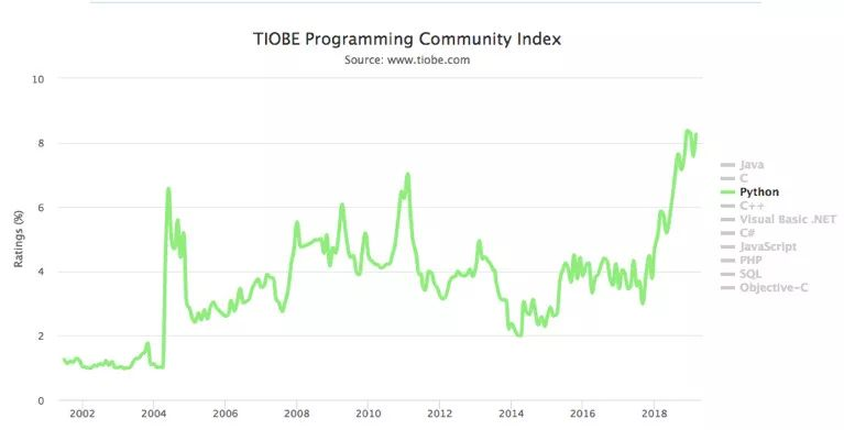 (截至2019年3月份,TIOBE的Python编程社区指数走势图)