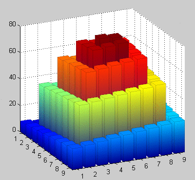 I'd like to draw nine colored bars (the size of the matrix), in the set [1,3]x[1,3], such that the bar's color is proportional to the bar's height. How can I do this?