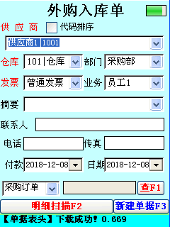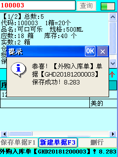 - 循环扫描商品,录入商品数量,将需要录单的商品扫描完毕,按【F1键】进行单据保存。