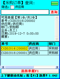 - 按上下键选择相应的【采购订单】后,按【F1键】选择单据,执行下推操作。