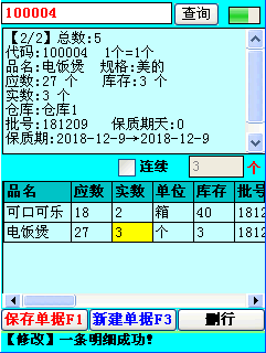 - 列表框的里的数量,仓库,批号,生产日期,有效期至,保质期是可以直接修改的,修改方法是光标移动到相应单元格,按【OK键】进行修改,修改后,按【OK键】确认。