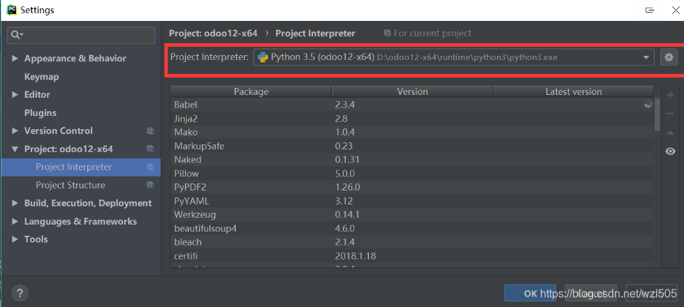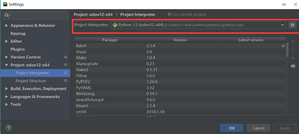 如果是odoo12 或者odoo11,请使用 python 3.5。 如果是odoo10,请使用 python 2.7