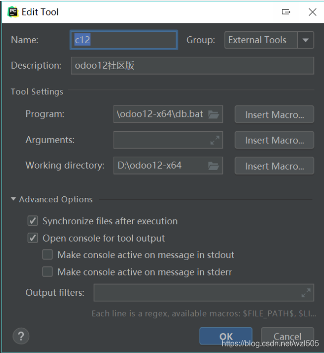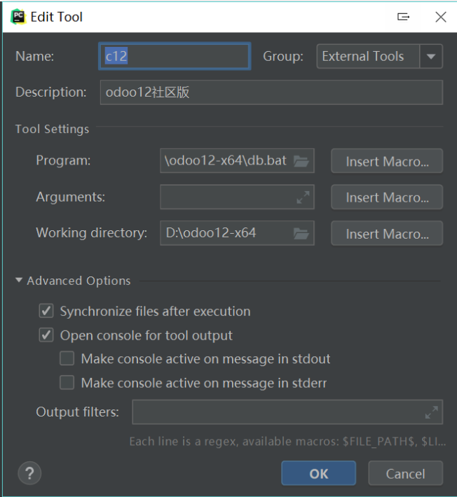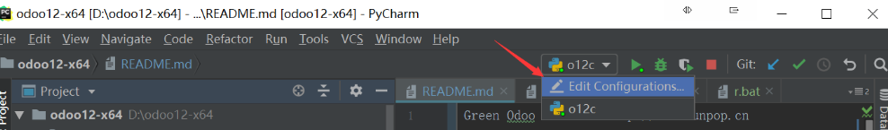 2、增加启动 odoo12的配置,具体目录按实际情况填写,本文假设odoo的目录是 d:\odoo12-x64,其中“5.执行前启动数据库”配置为绿色版根目录中的 db.bat 文件即可
