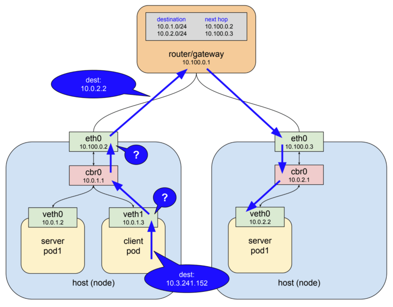 Secondly, it adds routing rules to the gateway at 10.100.0.1 telling it how packets destined for each bridge should be routed, i.e. which node’seth0the bridge can be reached through.Such a combination of virtual network interfaces, bridges, and routing rules is usually called an overlay network.