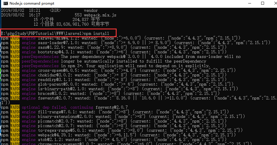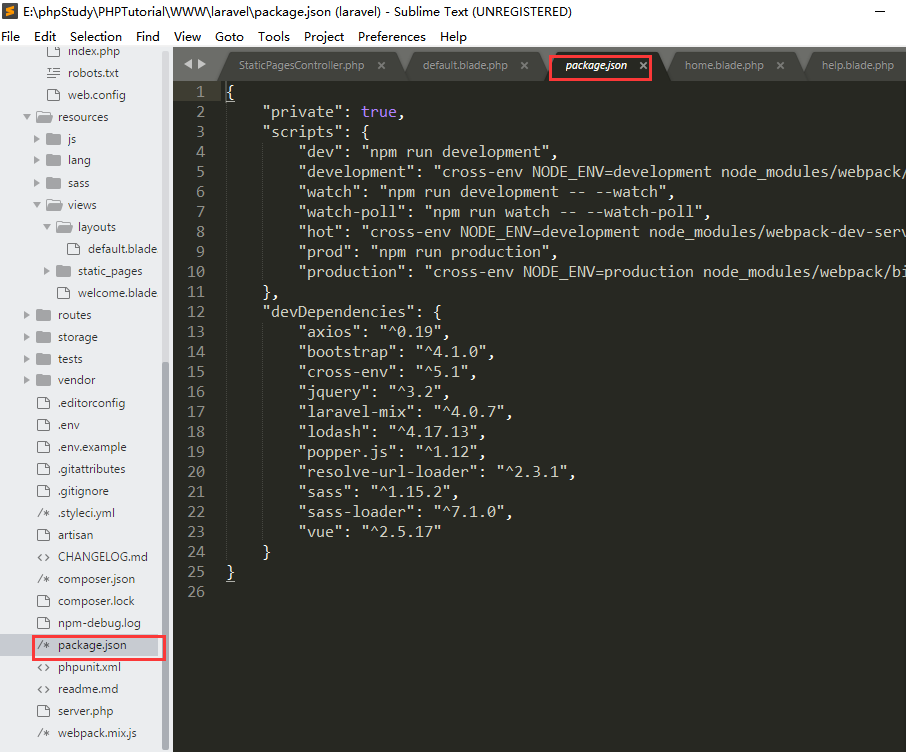 我们就可以运行 npm run dev 命令通过 Laravel Mix 来编译前端资源了,该命令定义在 package.json 中