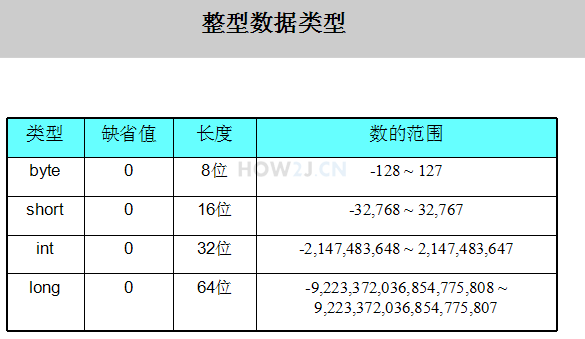 整型用于存放整数:byte、short、int、long