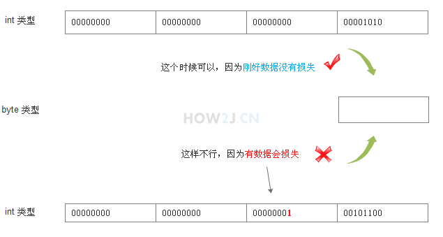 如果byte类型的变量赋予超出其范围的值,就会编译错误,这时就需要进行类型转换。