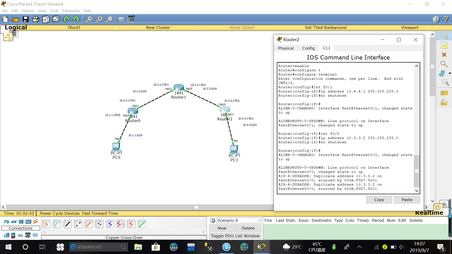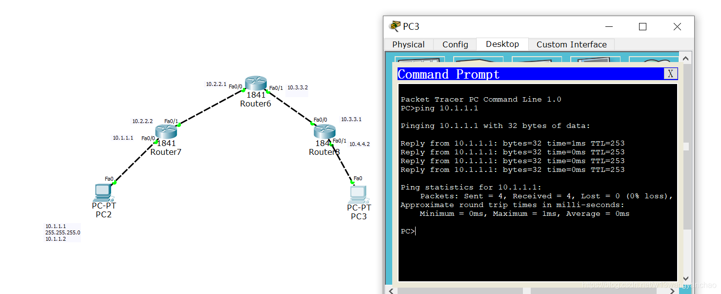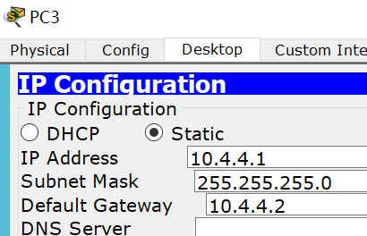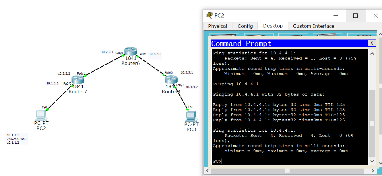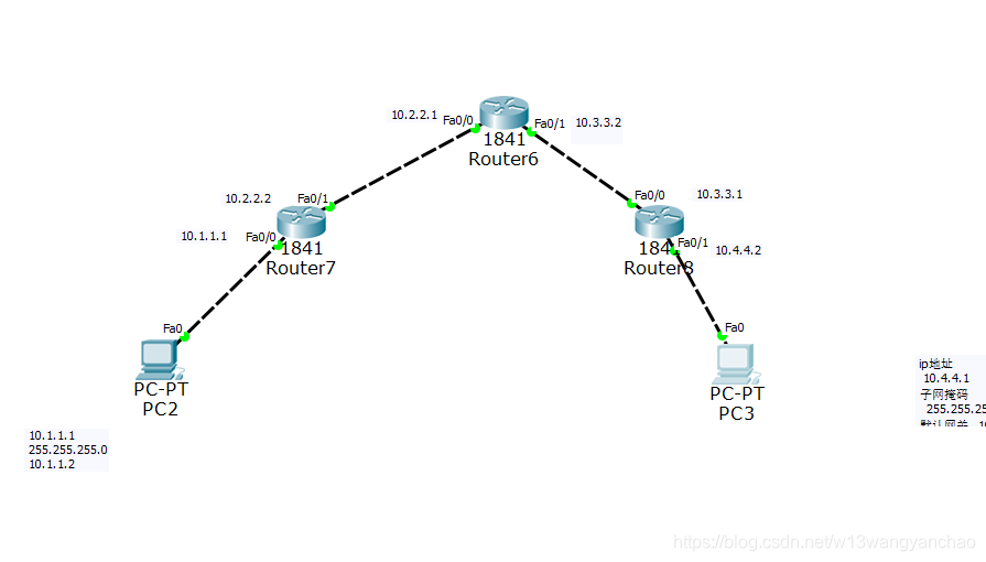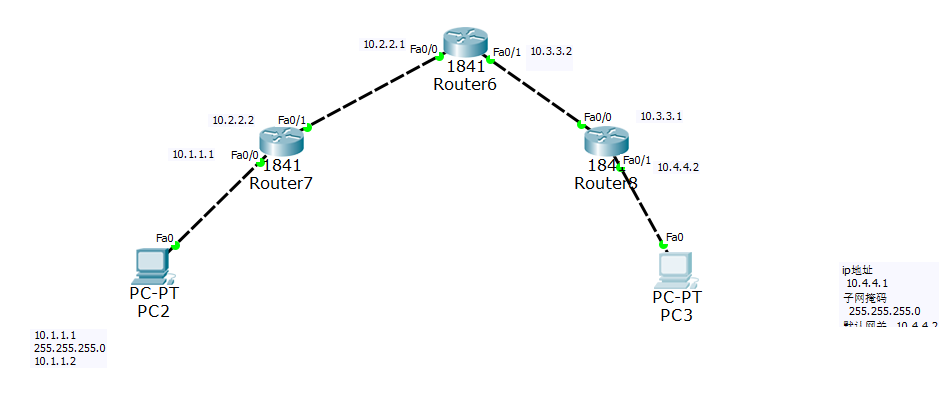 pc3:ip 10.4.4.1 子网掩码 255.255.255.0 默认网关 10.4.4.2