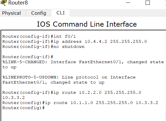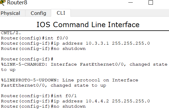 router8 f0/0:10.3.3.1 f0/1:10.4.4.2