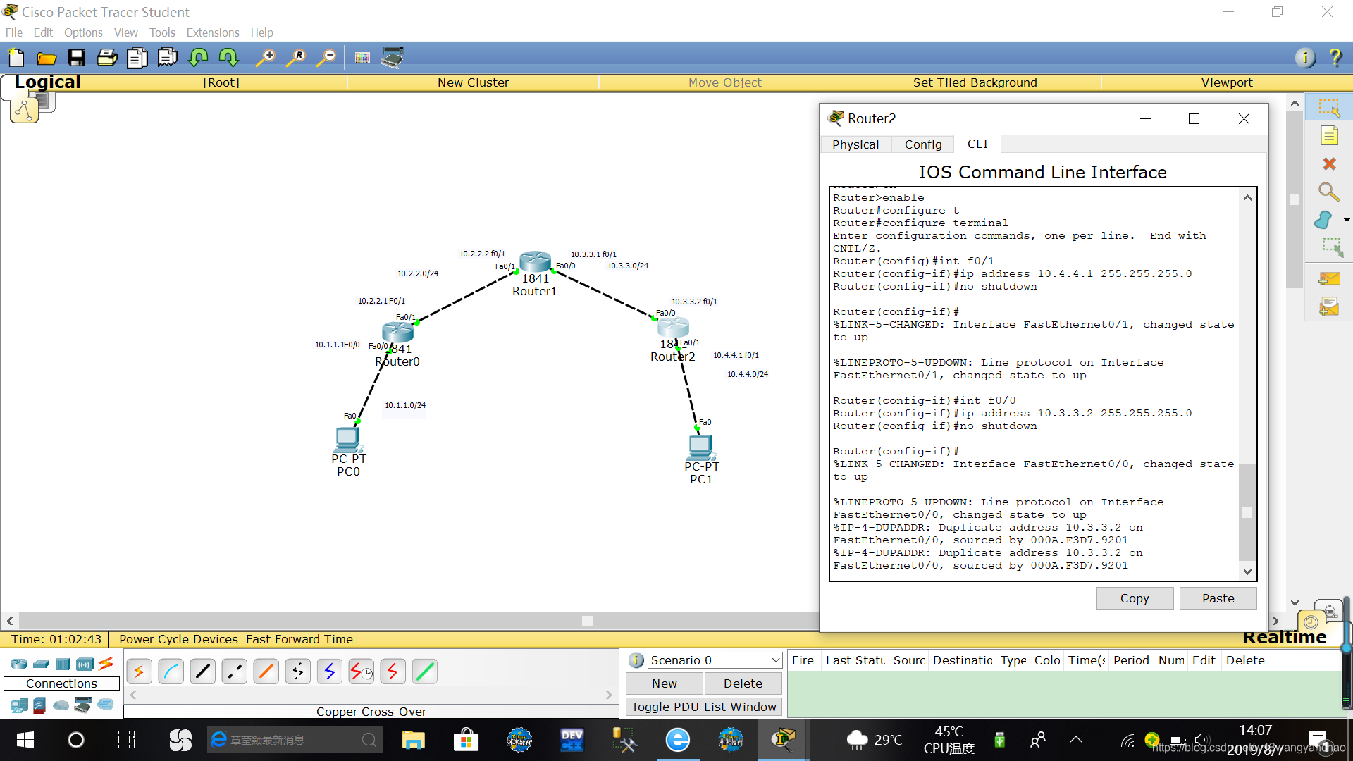 最后:【注意不要犯不该犯的错误】开始搭建的时候把f0/0 和f0/0接口在一个网段。要注意两个是接口不可能一样的
