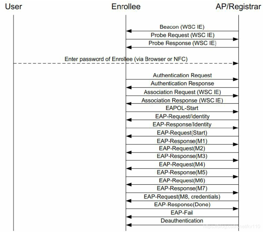 EAP-WSC流程从EAPOL-Start开始,结束于EAP-Fail帧,一共涉及14次EAPOL/EAP帧交换。在这14次帧交互过程中,STA和AP双方将协商安全配置信息(例如采用何种身份验证方法、何种加密方法,以及PSK等)。另外,这14次帧中,M1~M8属于EAP-WSC算法的内容,它们用于STA和AP双方确认身份以及传输安全配置信息。