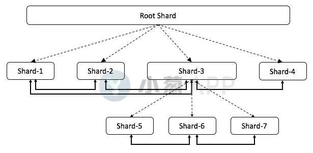 本体分片结构采取多层结构,每一个分片都支持独立的分布式部署,“母分片”(主分片)包含“子分片”。主分片在分片网络中处理全局请求;子分片在分片中处理智能合约请求。