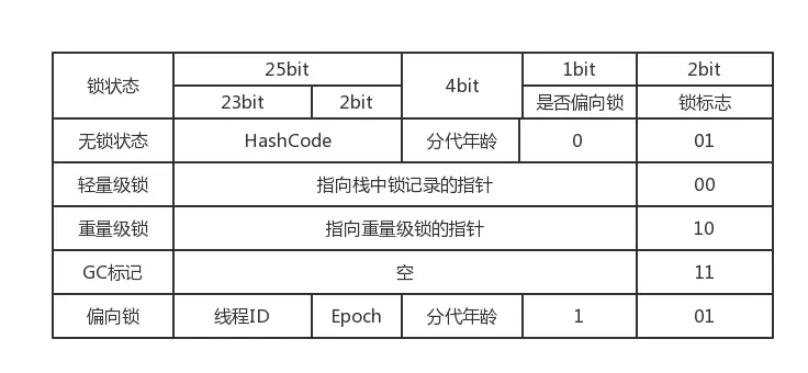 其中的Mark Word,它是一个可变的数据结构,即它的数据结构是依情况而定的。下面是在对应的锁状态下,Mark Word的数据结构(32位虚拟机下):