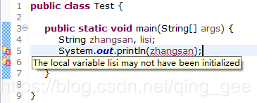 先来看第一行代码:String zhangsan, lisi;——声明了两个变量 zhangsan 和 lisi,他们的类型为 String。