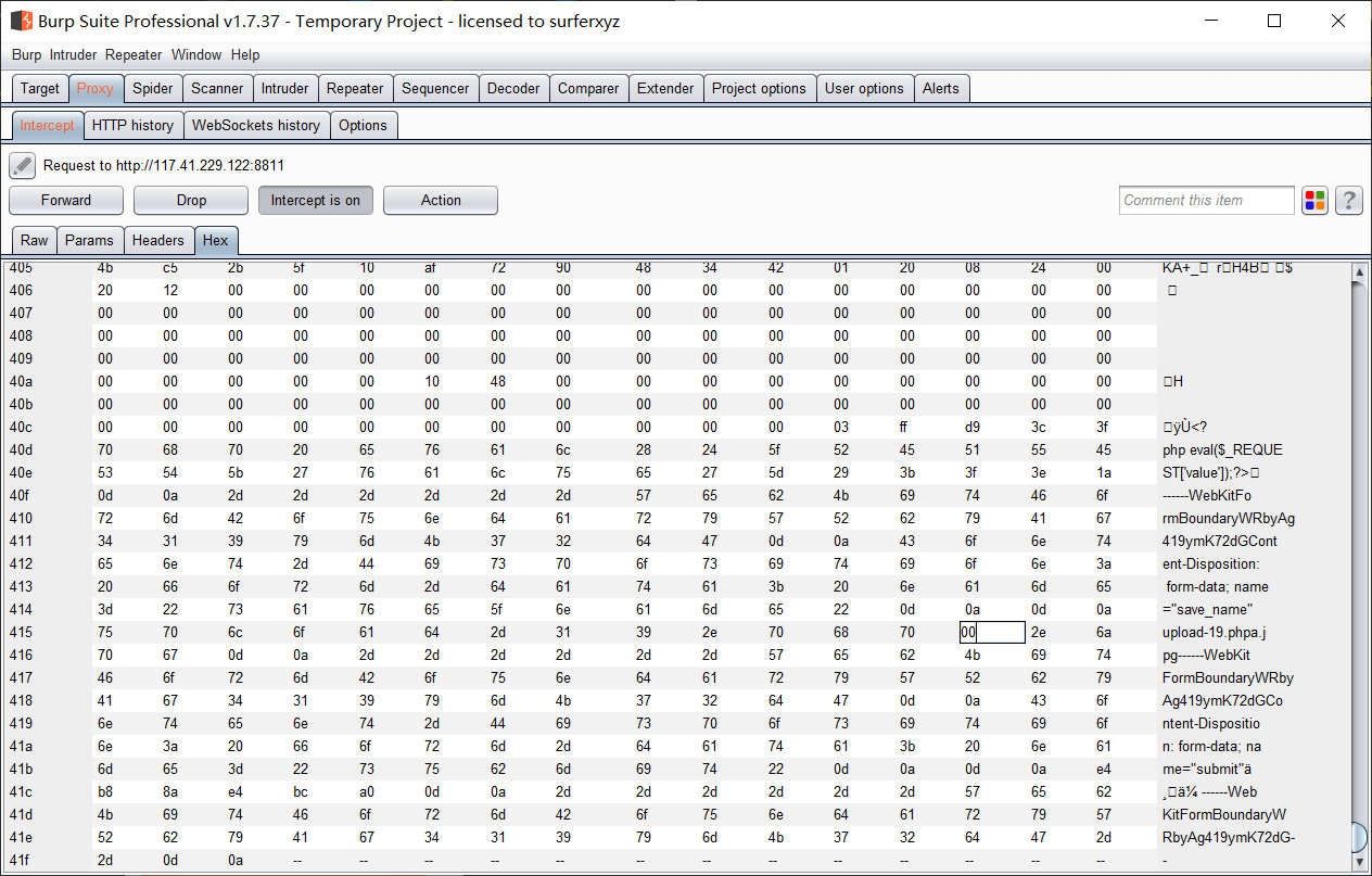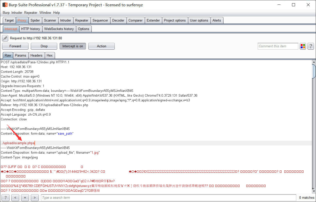 抓包在路径上附上example.phpa这加a是为了修改a的hex值为00截断