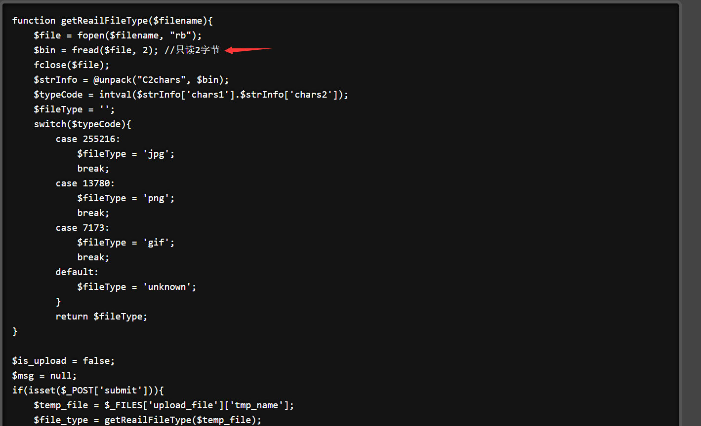 这里看到程序检查了上传文件的前两个字节,就是查看了文件头,所以这题只需要制作一只图片马即上传绕过