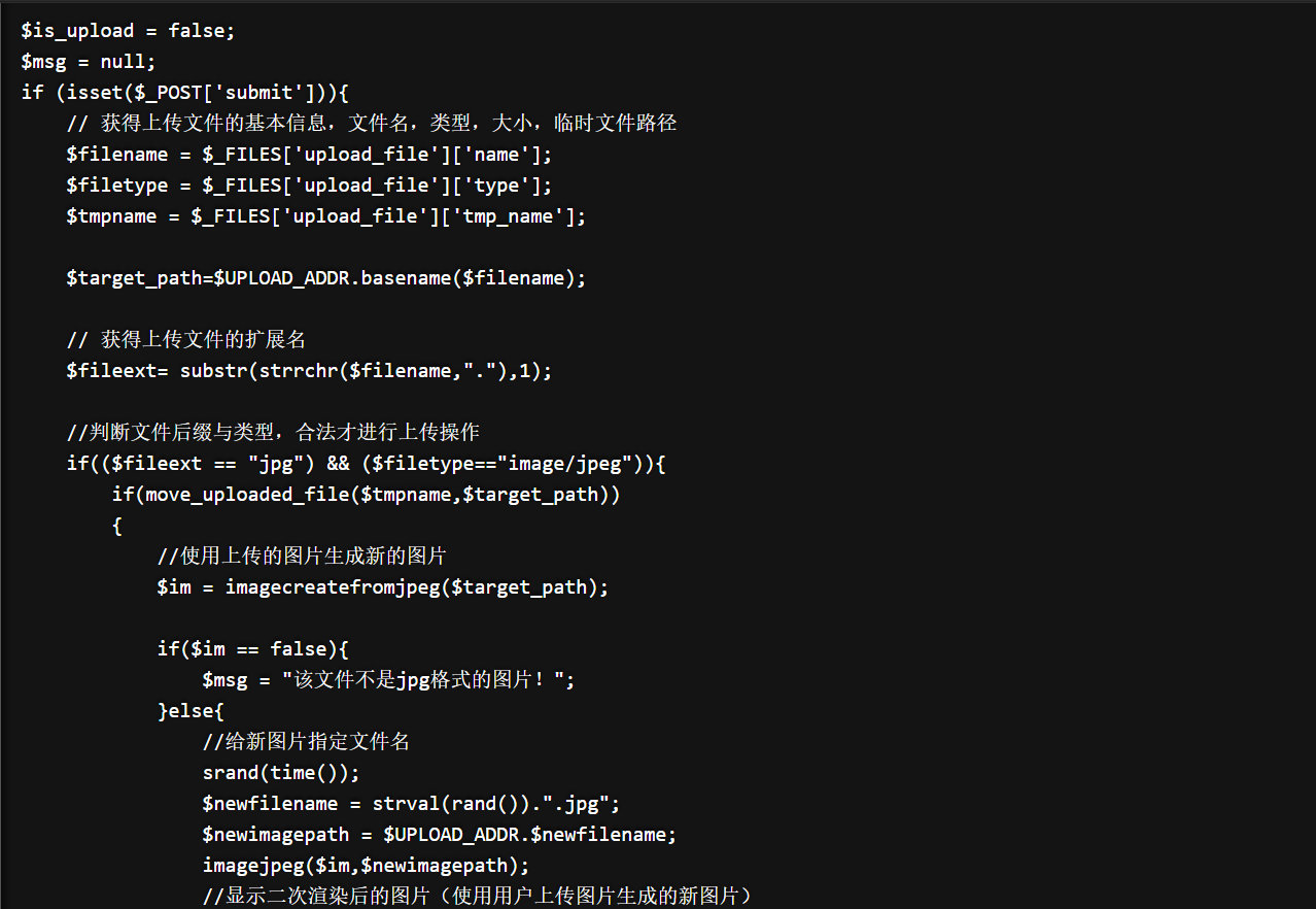 二次渲染:就是根据用户上传的图片,新生成一个图片,将原始图片删除,将新图片添加到数据库中。比如一些网站根据用户上传的头像生成大中小不同尺寸的图像。但是图片的内容是不会变的。所以还是图片马上传即可