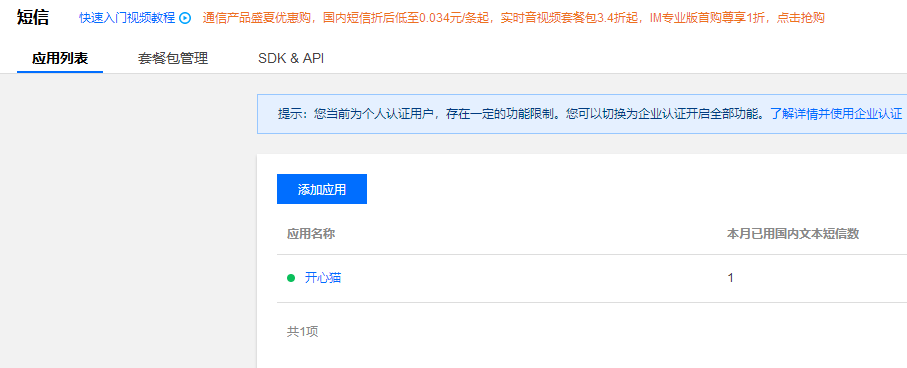 首先是需要去腾讯云注册账号,然后做个人或者公司的实名认证。通过之后再注册应用,应用也是需要通过认证来申请短信模板的;