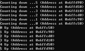 cout<<"Counting down ..."<<n<<" (Address at "<<&n<<")"<<endl;