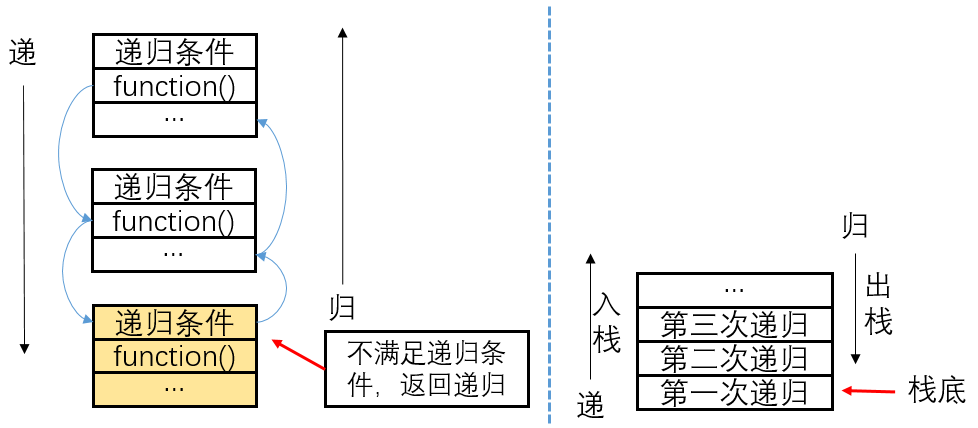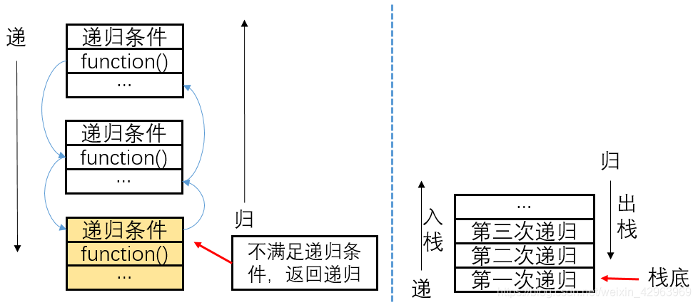 递归常用于重复性的程序当中。在递归中,每次递归调用都会创建自己的一套变量,保存在不同的地址空间当中。如下所示,可以用栈的入栈和出栈来表示递归。
