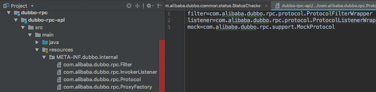 配置在目录/META_INF/dubbo/internal/com.alibaba.dubbo.rpc.Protocol文件中,文件内容为: