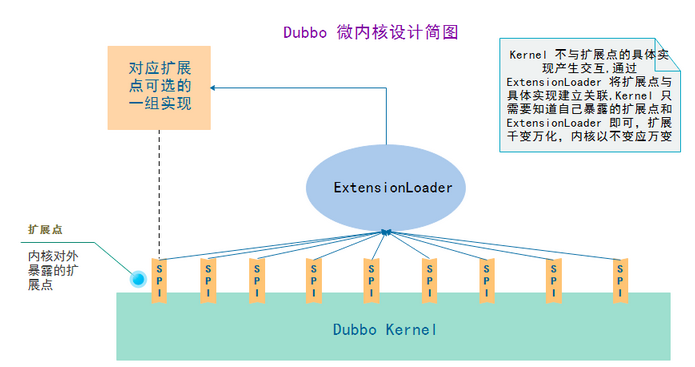 扩展加载器绝对是一个核心组件了 ,它控制着 dubbo 内部所有扩展点的初始化、加载扩展的过程。这个类的源码是很有必要深入学习的。从 Dubbo 内核设计简图可以看到,现在的学习还没有接触到 dubbo 的内核。