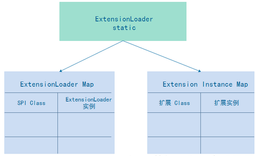 ExtensionLoader 中会存储两个静态属性 , EXTENSION_LOADERS 保存了内核开放的扩展点对应的 ExtensionLoader 实例对象 (说明了一种扩展点有一个对应的 ExtensionLoader 对象)。EXTENSION_INSTANCES 保存了扩展类型 (Class) 和扩展类型的实例对象。
