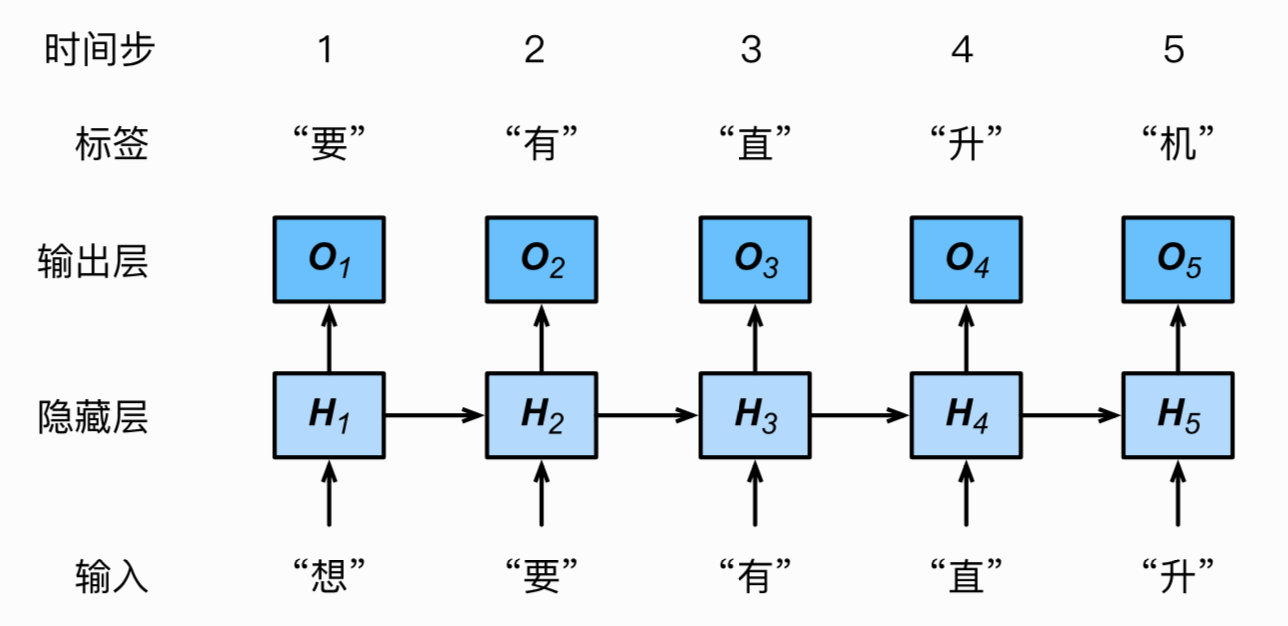 取决于⽂本序列“想”“要”“有”。 由于训练数据中该序列的下⼀个词为“直”,时间步3的损失将取决于该时间步基于序列“想”“要”“有”生成下⼀个词的概率分布与该时间步的标签“直”。